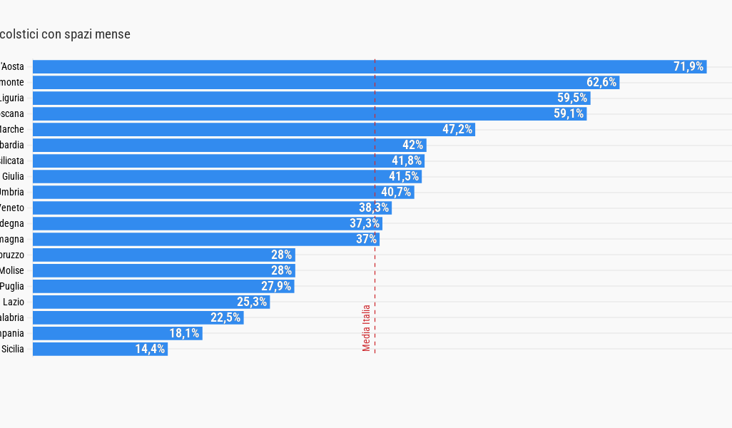 In un edificio scolastico statale su tre, in media, c'è una mensa. Ma se in Valle d’Aosta oltre il 70% dei plessi ne ha, in Sicilia questa soglia non raggiunge neanche il 15%. Differenze territoriali che rallentano il contrasto alla povertà alimentare tra i minori.