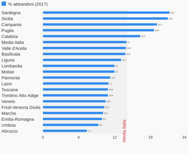 In Sicilia e in Sardegna gli abbandoni superano il 20%