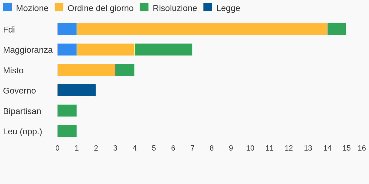 Come possiamo vedere anche dal grafico, la maggior parte delle disposizioni approvate sono state presentate dalle opposizioni. La metà degli atti licenziati infatti proviene da Fratelli d’Italia (unico gruppo formalmente all'opposizione) a cui si aggiungono 4 atti presentati da esponenti del gruppo misto e uno da Nicola Fratoianni che pur facendo parte di Liberi e uguali non sostiene il governo Draghi. Sono solo 7 invece gli atti espressione della maggioranza.