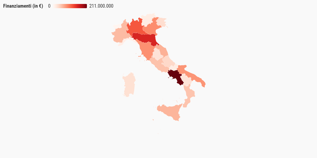 Tra le regioni italiane, quelle che riportano il maggior numero di interventi sono Campania (34), Emilia-Romagna (23), Calabria e Toscana (16). Sono invece minori in Molise, Trentino-Alto Adige e Valle d’Aosta dove sono 2 per regione. Anche per quel che riguarda gli importi la Campania riporta le cifre maggiori, con circa 211,6 milioni di euro. Seguono Emilia-Romagna (151,3 milioni), Lombardia (118,7 milioni) e Veneto (circa 85,6 milioni). Finanziamenti minori in Trentino-Alto Adige (14,7 milioni), Liguria (12,5 milioni) e Valle d’Aosta (quasi 4,6 milioni).