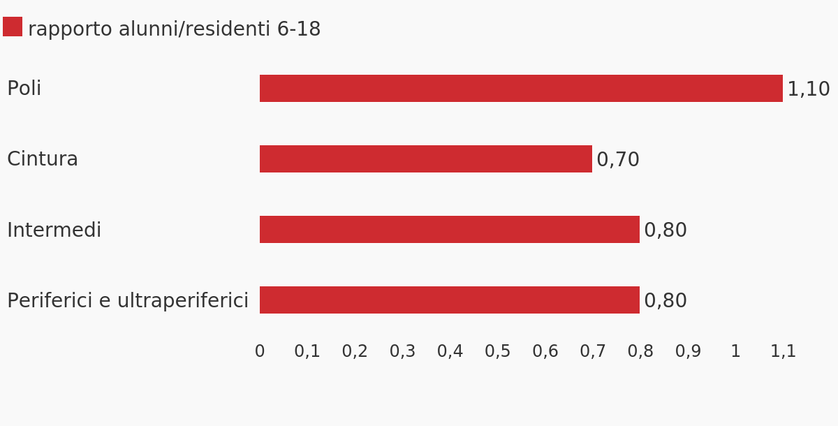 Per i comuni intermedi, periferici e ultraperiferici, il rapporto medio tra alunni e residenti 6-18 è pari a 0,8. Non tutte le aree interne però sono ugualmente attrattive in termini di popolazione scolastica.