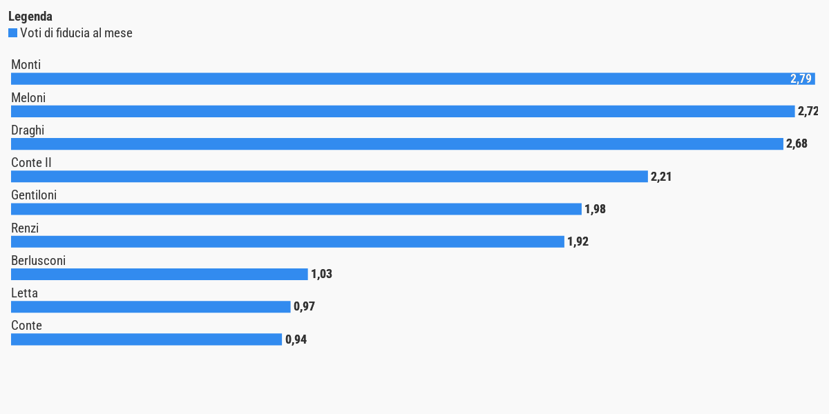 - Mediamente il governo Meloni pone 2,72 questioni di fiducia al mese. Solo il governo Monti riporta un dato superiore.