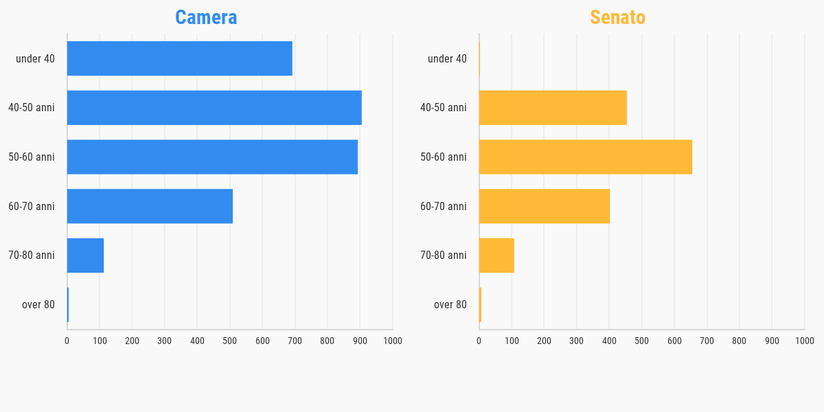 Una cifra che si abbassa poi considerevolmente se contiamo soltanto i giovanissimi, di età compresa tra i 20 e i 30 anni. Parliamo in questo caso di appena 134 candidati, meno del 3% del totale. Questi numeri bassi sono diretta conseguenza degli articoli 56 e 58 della costituzione, che stabiliscono come età minima per accedere alla camera e al senato rispettivamente i 25 e i 40 anni.
