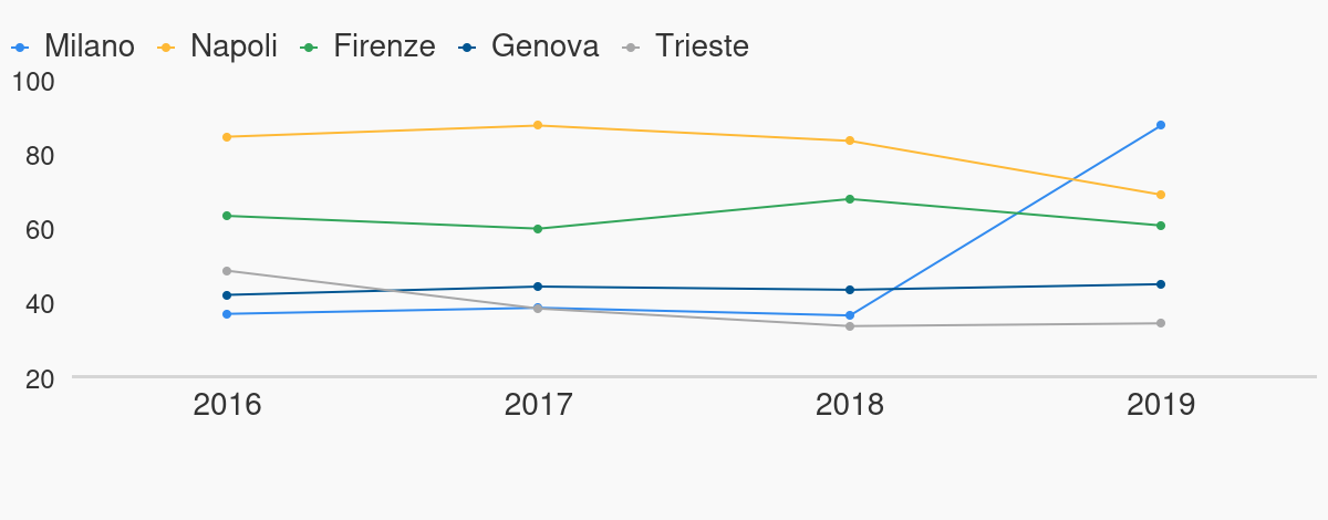 Il trend è invertito invece a Napoli. Nella città partenopea, infatti, nel 2016 si spendevano 84,36 euro pro capite, quasi 20 euro in più rispetto alle somme investite nel 2019 (-18,5% in quattro anni). Nel tempo hanno diminuito la spesa per risorse umane anche Trieste e Firenze, mentre l'ha incrementata leggermente Genova.