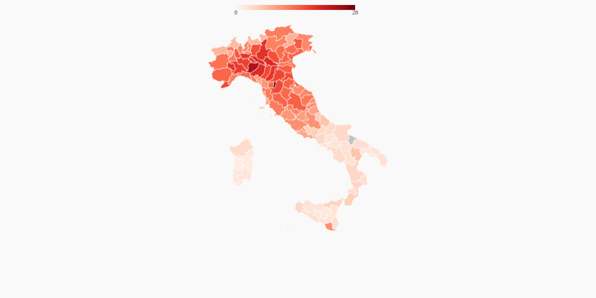 La seguivano sotto questo aspetto Piacenza, in Emilia-Romagna (23,5%) e Mantova, in Lombardia (19,4%). Mentre a registrare le cifre più basse erano le province sarde, in particolare quella di Oristano (1,5%) e Nuoro (1,7%).