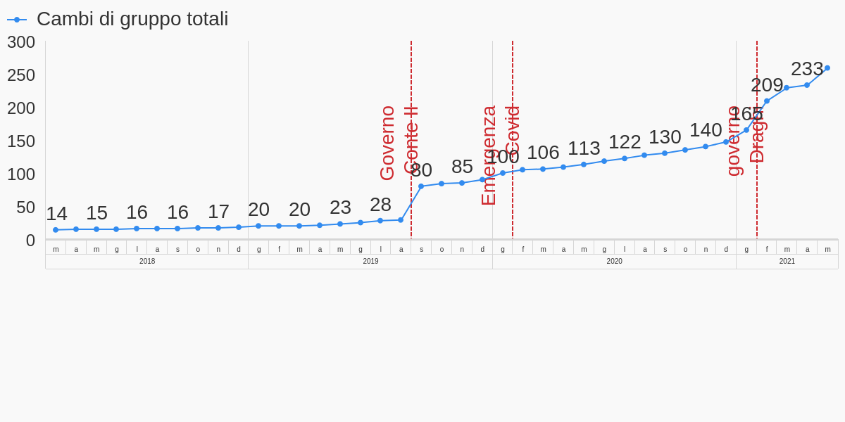 Numero cumulato di cambi di gruppo da inizio legislatura, mese per mese