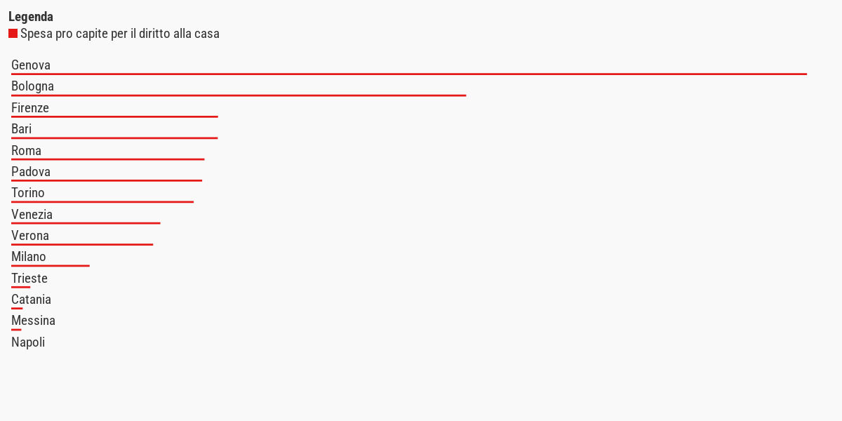 Per quel che riguarda il diritto all’abitare, le tre città che spendono di più si trovano nelle zone del centro-nord del paese: Genova (58,26 euro a persona), Bologna (33,31) e Firenze (15,14). Uscite minori invece a Trieste (1,40), Catania (0,84) e Messina (0,74). A Napoli non si registrano spese per la voce considerata. Tuttavia, spese maggiori o minori non definiscono giudizi di valore su come viene trattata una materia. Inoltre, spesso i comuni non inseriscono le spese relative a un determinato ambito nella voce dedicata.