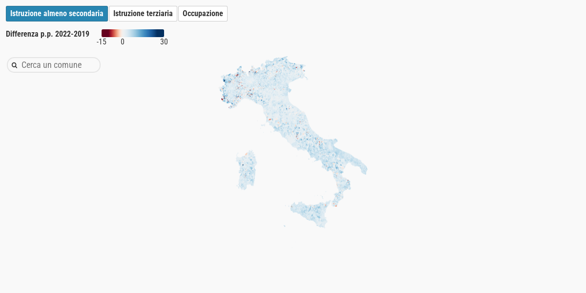 Tra 2019 e 2022, quasi tutti i comuni riportano una crescita delle persone tra 25 e 49 anni con titoli di studio secondari superiori e terziari (rispettivamente, il 93,7% e il 92,6% sui 7.903 territori presenti in Italia nel 2022). Al contrario, il tasso di occupazione nella popolazione con più di 15 anni è in crescita per il 50,8% dei territori. Questi sono dati che vanno comunque considerati alla luce dell’importante incidenza dei piccoli comuni italiani: sono infatti 5.532 quelli che non superano i 5.000 abitanti, quasi il 70% di tutti quelli presenti sul territorio nazionale.