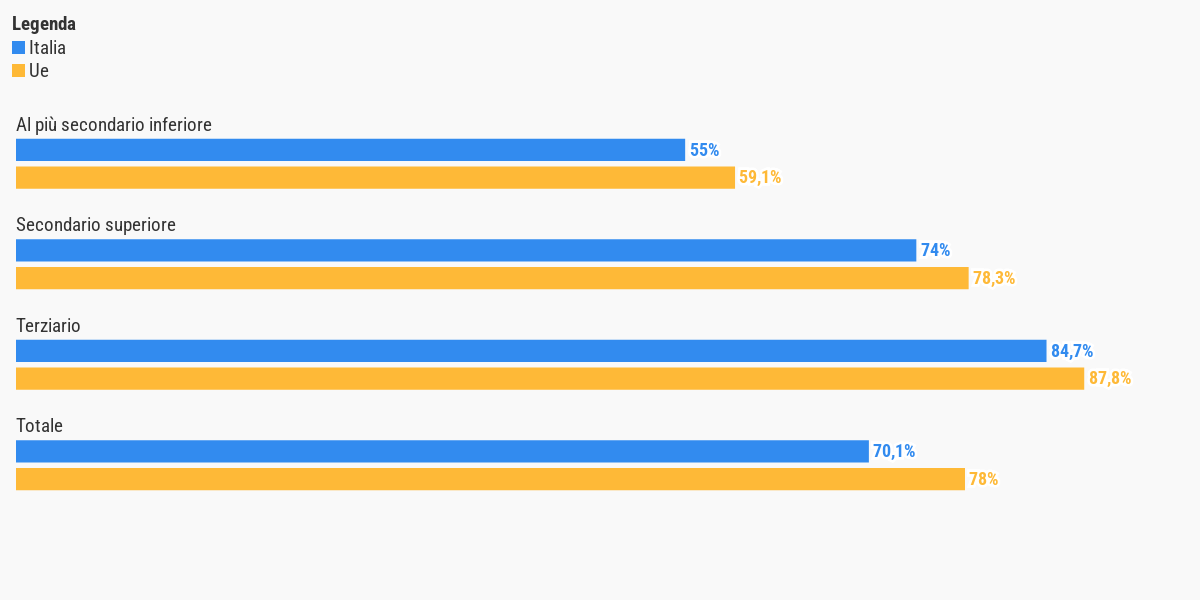 Sempre nel 2024, il tasso di occupazione nei paesi europei è pari al 78%. Questo dato riporta però un’ampia forbice tra chi ha un titolo al più secondario inferiore (59,1%) rispetto a chi invece ha concluso la scuola secondaria superiore (78,3%) o ha concluso un ciclo di studi terziario (87,8%). Una dinamica evidente anche in Italia, dove il tasso di occupazione totale è pari al 70,1% ma scende al 55% per chi ha concluso solo le scuole medie per poi risalire al 74% e all’84,7% rispettivamente per chi è in possesso di un diploma di scuola superiore e una laurea o titolo equiparabile.