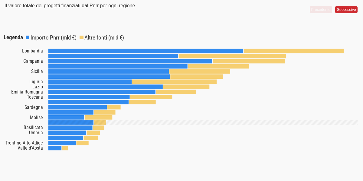 Nel primo grafico è rappresentato il valore totale dei progetti finanziati del tutto o in parte dal Pnrr in ogni regione. Nel secondo grafico è invece riportata la percentuale di copertura economica garantita dal Pnrr rispetto al costo totale dei progetti finanziati in ogni regione. Nel piano sono presenti progetti cosiddetti di “ambito nazionale”, in questo caso è impossibile una territorializzazione. Il valore totale di questo tipo di interventi ammonta a circa 10 miliardi di euro. Altri progetti invece interessano il territorio di più regioni. In questo caso, non essendo possibile una suddivisione puntuale degli importi è stato assegnato l’intero valore a tutte le regioni interessate.