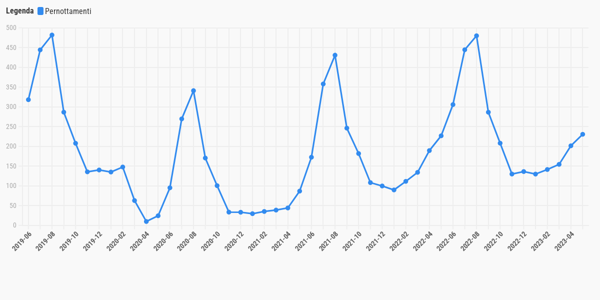 Come si può vedere dal grafico, il turismo subisce sempre delle forti variazioni stagionali. D’estate, soprattutto nel mese di agosto, si registrano dei forti picchi, mentre i valori sono minimi nel periodo invernale.