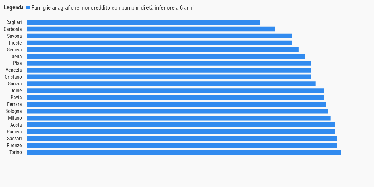 Considerando i dati a disposizione, focalizzando l’analisi esclusivamente sui comuni capoluogo, possiamo osservare che in media la percentuale di famiglie anagrafiche monoreddito con almeno un figlio di età inferiore ai 6 anni nel 2020 era pari al 17,9% rispetto al totale delle famiglie anagrafiche. Le percentuali più alte sono riportate dai comuni pugliesi di Andria (31,5%) e Barletta (28,3%), seguite dalla toscana Prato (26,7%). Da segnalare anche i dati di Napoli (24,4%) e Palermo (23,8%), casi particolarmente rilevanti visto che stiamo parlando rispettivamente del terzo e del quinto comune più popoloso d’Italia.