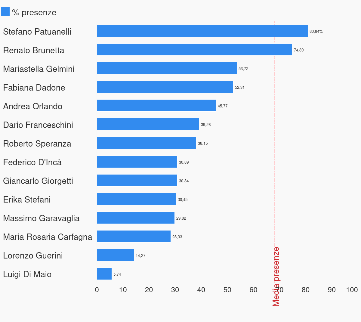 Tra i membri dell’attuale consiglio dei ministri, 14 sono anche parlamentari. Molti hanno già svolto incarichi di governo nella legislatura. Anche per questo motivo la maggior parte ha un livello di partecipazione ai lavori delle camere estremamente basso.