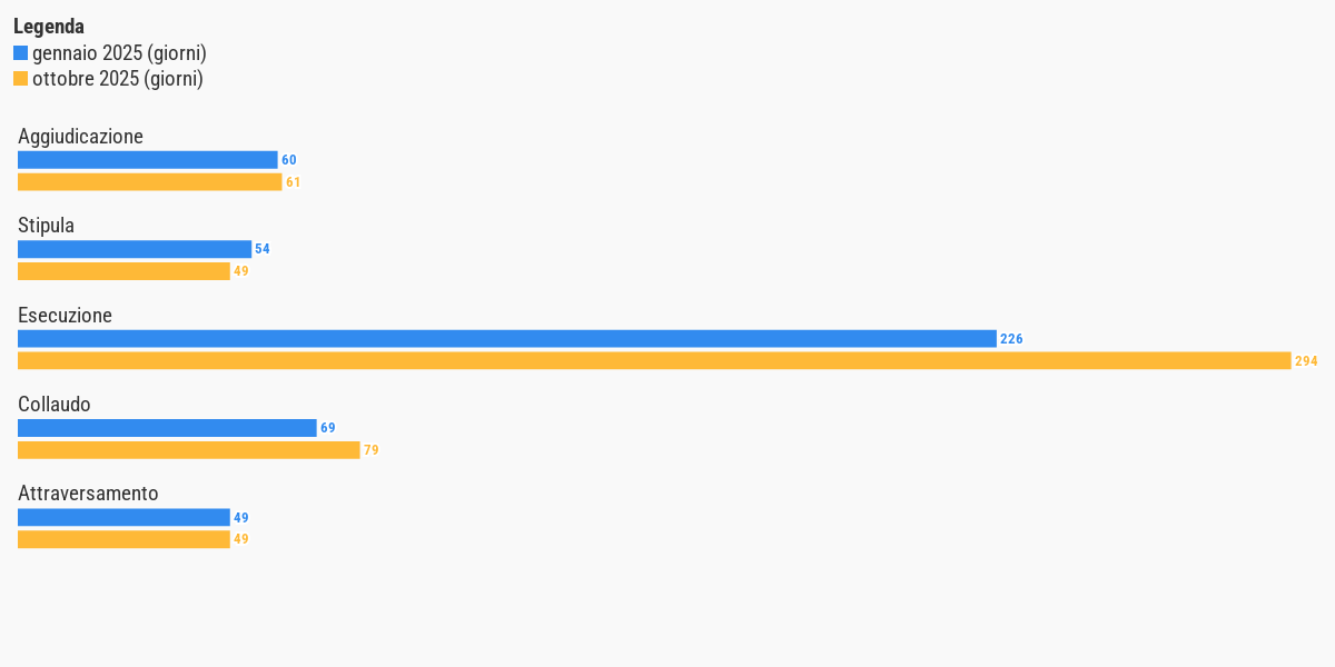 Nel grafico, per motivi di visualizzazione, non sono rappresentati i tempi di attraversamento perché spesso riportano un valore negativo. Ciò indica una sovrapposizione temporale tra le fasi, dovuta all’avvio anticipato di alcune attività o all’efficacia delle misure di semplificazione che permettono di procedere con i lavori parallelamente agli adempimenti burocratici.