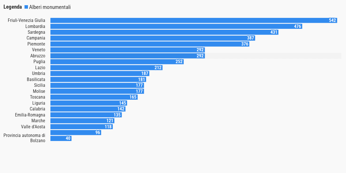 La regione italiana caratterizzata dal maggior numero di alberi monumentali è il Friuli-Venezia Giulia. I suoi 542 esemplari compongono l’11% di quelli registrati in Italia. Seguono Lombardia (476), Sardegna (431) e Campania (387). Ad averne di meno invece la Valle d’Aosta (118), la provincia autonoma di Trento (96) e quella di Bolzano (40).