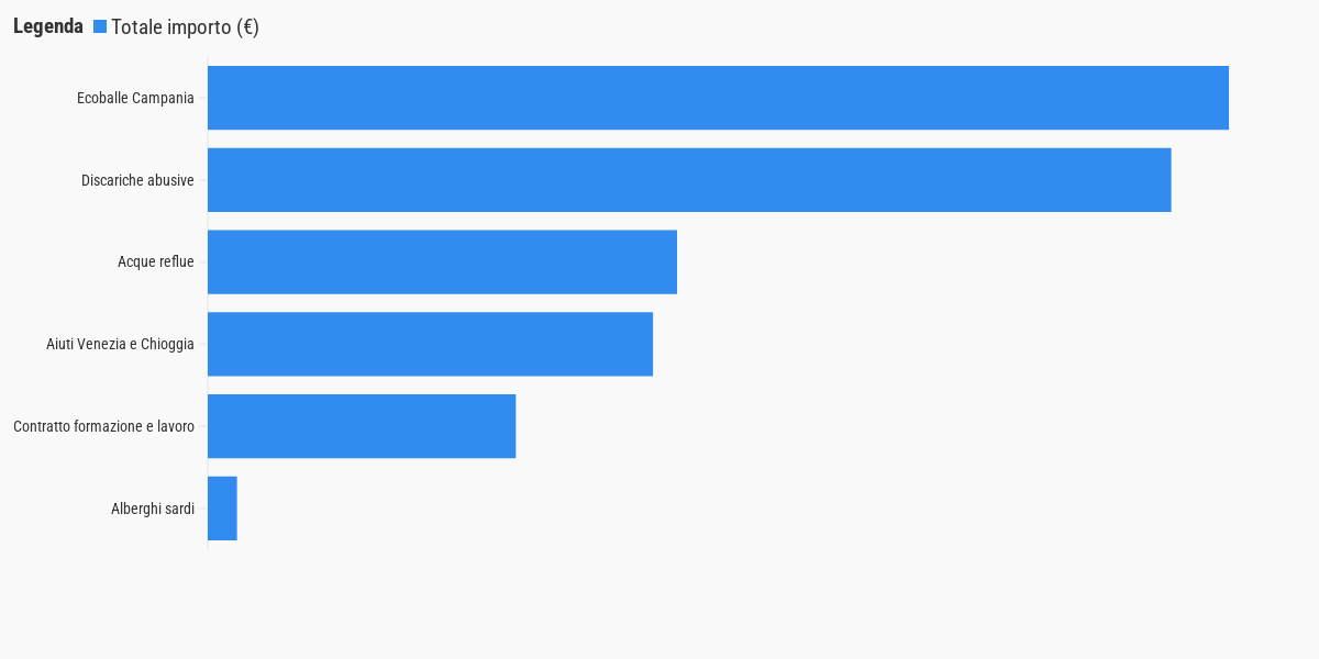 Oltre alle procedure che abbiamo già citato in precedenza in merito alla gestione dei rifiuti e delle acque reflue, tra quelle che hanno comportato il pagamento di sanzioni per il nostro paese ve ne sono anche altre 3 che riguardano il mancato recupero degli aiuti illegittimi concessi alle imprese nel territorio di Venezia e Chioggia (INFR(2012)2202), il mancato recupero degli aiuti illegittimi concessi per interventi a favore dell’occupazione INFR(2022)4113 e il mancato recupero degli aiuti di stato concessi agli alberghi della Sardegna INFR(2014)2140.