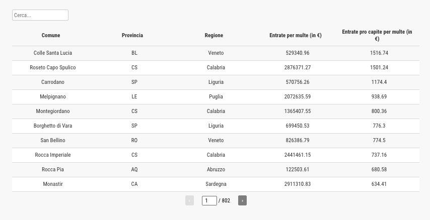 I dati mostrano per ogni comune italiano le entrate totali e pro capite nella voce “Proventi derivanti dall’attività di controllo e repressione delle irregolarità e degli illeciti”. Da notare che spesso i comuni non inseriscono le entrate relative a un determinato ambito nella voce dedicata, a discapito di un’analisi completa. Non sono disponibili i dati di alcuni comuni perché alla data di pubblicazione non risultano accessibili i rispettivi bilanci consuntivi 2019.