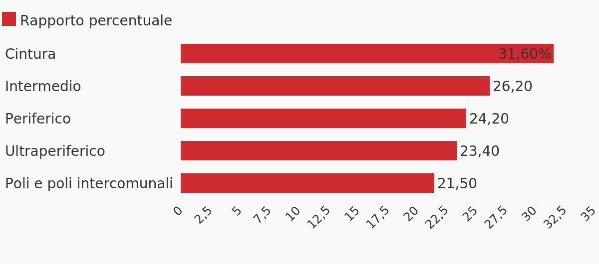 I dati confermano come la presenza di mense nei comuni periferici e ultraperiferici sia scarsa. In queste zone infatti, meno di un edificio su quattro ha la mensa. Suddividendo gli enti locali in base alla loro classe di appartenenza, infatti, notiamo che il maggior numero di mense si trova nei comuni di cintura, cioè quelli che fanno parte dell'hinterland delle città principali (31,6 mense ogni 100 edifici scolastici), seguono i comuni intermedi (26,2%), i comuni periferici (24,2%), quelli ultraperiferici (23,4%), infine i comuni polo e poli intercomunali (21,5%).
