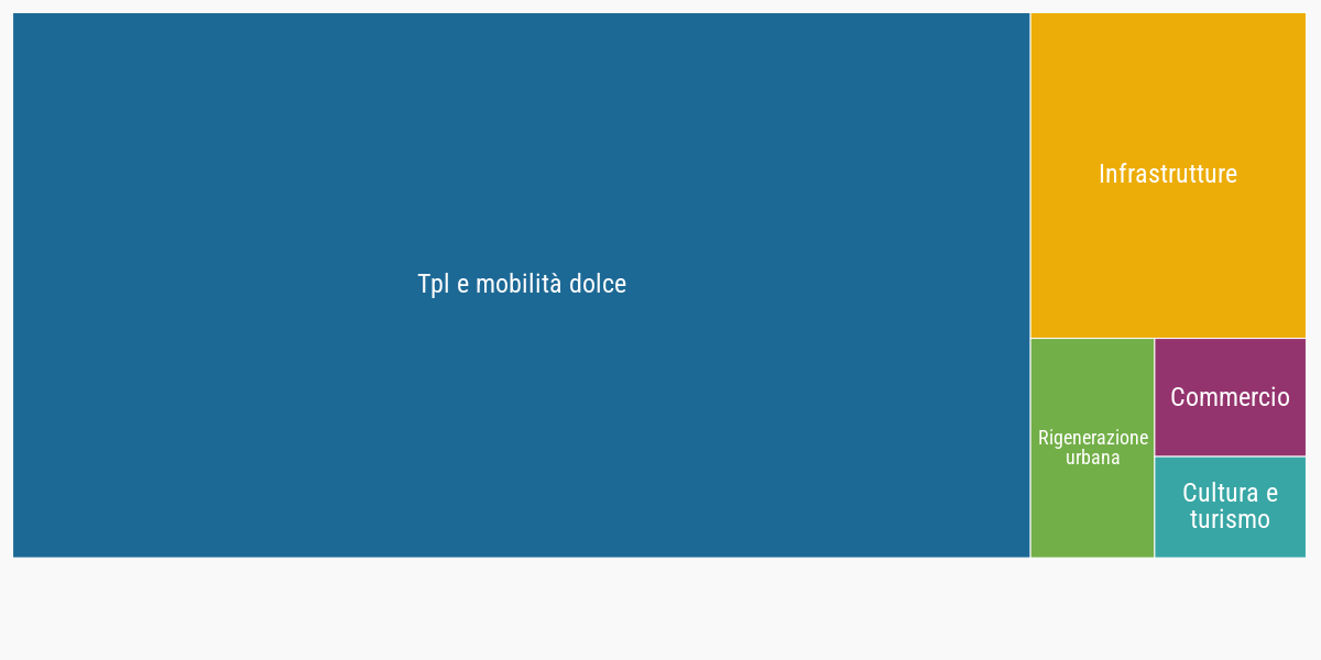 Per quanto riguarda il numero di progetti, invece, la rigenerazione urbana è il tema prevalente, con 12 interventi finanziati. Seguono quelli nel trasporto pubblico locale e la mobilità dolce (10), nel commercio (6), per la cultura e il turismo (4) e per infrastrutture (3).