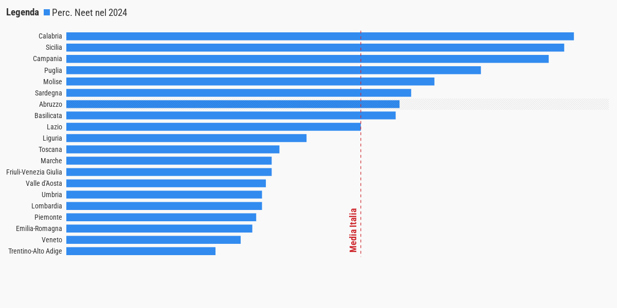 Nel 2024 i giovani abruzzesi che non si formano, non hanno un lavoro né lo cercano erano il 17,2%. Uno dei livelli più contenuti del mezzogiorno ma superiore alla media nazionale e ancora lontano dagli obiettivi comunitari in materia.