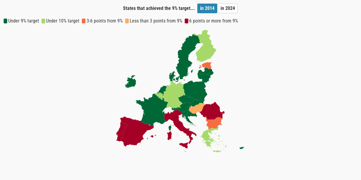 Nel contesto Ue, i paesi che dal 2014 hanno migliorato di più il loro dato siano quelli mediterranei, in cui il fenomeno partiva da livelli molto più alti della media. In particolare: Portogallo (dal 17,3% di allora al 6,6% attuale, -10,7 punti) e Spagna (da 21,9% a 13%, -8,9 punti). Ai paesi iberici seguono Malta (-7,4), Grecia (-6) e Italia (-5,2).
