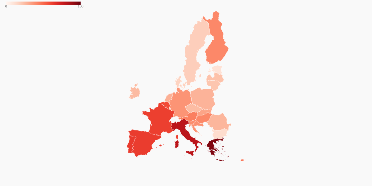 Per quel che riguarda il debito pubblico, misurato in relazione al Pil, i paesi che registrano i valori più bassi si trovano nel centro-nord del continente: Estonia (18,4%), Bulgaria (22,9%) e Lussemburgo (24,6%). Gli stati che invece sono caratterizzati dai valori maggiori si trovano tutti nella zona mediterranea. Si tratta di Grecia (171,3%), Italia (144,4%), Portogallo (113,9%) e Spagna (113,2%). L’Italia è anche il paese europeo che riporta il deficit maggiore, sempre calcolato rispetto al Pil. È pari all’8%. Seguono Ungheria (6,2%), Romania (6,2%) e Malta (5,8%). Riportano invece i surplus maggiori Danimarca (3,3%), Cipro (2,1%) e Irlanda (1,6%).