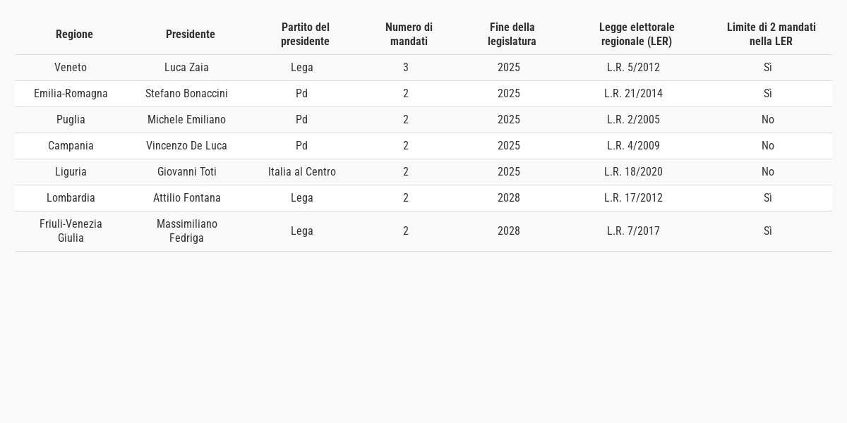 Per ciascuna regione in cui è in carica un presidente eletto a suffragio universale diretto che sta ricoprendo almeno il secondo mandato sono indicati: il partito di riferimento, il numero di mandati in carica, l’anno in cui è prevista la fine della legislatura e dunque le elezioni successive, la legge elettorale regionale vigente e l’eventuale previsione di un limite al numero di mandati che possono essere svolti dal presidente. Tale limite è in effetti imposto da una legge quadro nazionale (L. 165/2004). L’applicabilità di tale limite senza che questo sia recepito dalle norme regionali tuttavia è messa in discussione.