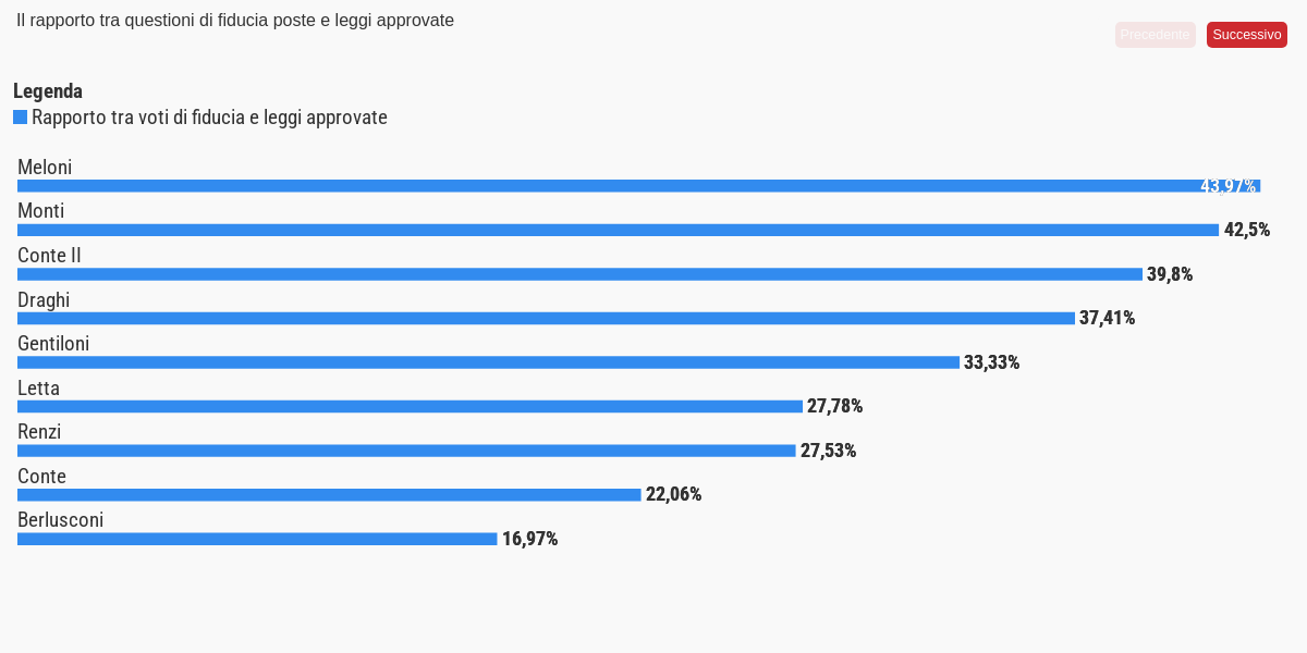 Dal suo insediamento nell’ottobre del 2022 fino all’aprile del 2024, il governo Meloni ha posto in totale 51 questioni di fiducia per l’approvazione di disegni di legge. In valori assoluti, due esecutivi hanno fatto registrare valori più elevati durante il loro periodo a palazzo Chigi. Si tratta dei governi Renzi (68) e Draghi (51), mentre quello guidato da Mario Monti ha fatto registrare lo stesso numero di voti di fiducia di quello attualmente in carica. Questi esecutivi hanno però avuto tutti durate diverse. Il governo guidato da Matteo Renzi ad esempio è rimasto in carica quasi il doppio del tempo rispetto a quello di Giorgia Meloni. Per permettere un confronto omogeneo tra esecutivi di diversa durata è quindi utile valutare il numero medio di questioni di fiducia poste al mese. Da questo punto di vista al primo posto troviamo il governo Monti (3 voti di fiducia al mese di media). Seguono Draghi (2,89) e Meloni (2,83). Rispetto al nostro ultimo aggiornamento sul tema, il dato riguardante l’esecutivo attualmente in carica risulta in diminuzione. Ovviamente il dato del governo Meloni è l’unico suscettibile di variazioni mentre negli altri casi parliamo di dati già consolidati. Sull’evoluzione di questo dato incide molto ovviamente anche la quantità di disegni di legge che il parlamento discute e vota di mese in mese. Logicamente, un basso numero di Ddl in discussione comporterà anche un basso numero di questioni di fiducia poste dal governo. Viceversa, all’aumentare delle proposte da approvare (specie quelle di iniziativa governativa) è più probabile che l’esecutivo sia portato a ricorrere alla fiducia. Questo sia per velocizzare i tempi che per evitare che il parlamento modifichi eccessivamente il provvedimento in esame. Da questo punto di vista è interessante osservare che l’attuale esecutivo fa registrare il rapporto più alto tra voti di fiducia e numero di leggi approvate pari a circa il 44%. Seguono i governi Monti (42,5%) e Conte II (39,8%).