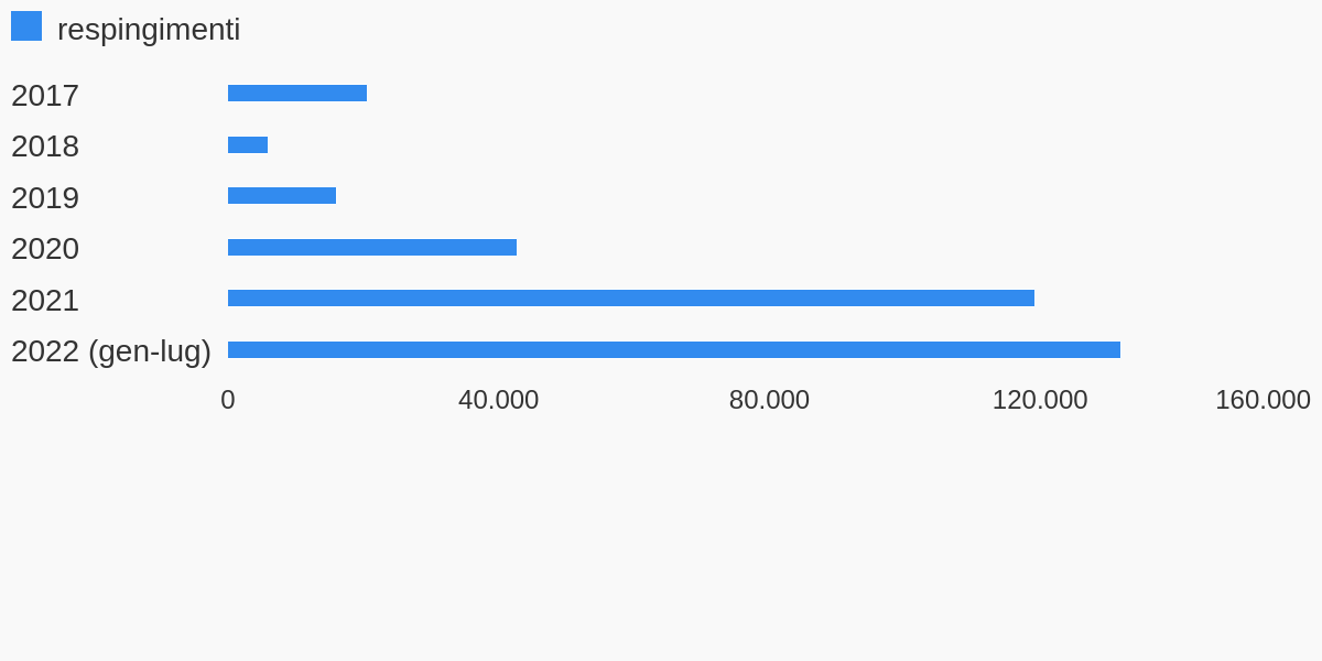 Se analizziamo i respingimenti di coloro che la polizia ungherese chiama “immigrati irregolari”, ossia richiedenti asilo che si presentano alle frontiere serbo-ungherese e croato-ungherese, notiamo un’impennata nell’ultimo biennio. Nel 2021, infatti, quasi 120mila sono stati i respingimenti ai confini. Un dato già superato dal numero di respingimenti dei primi 7 mesi di quest’anno: oltre 132mila.