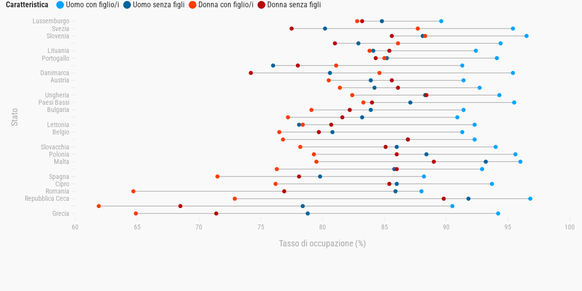 Il dato rappresenta il tasso di occupazione di donne e uomini con e senza figli nei paesi dell’Unione europea.