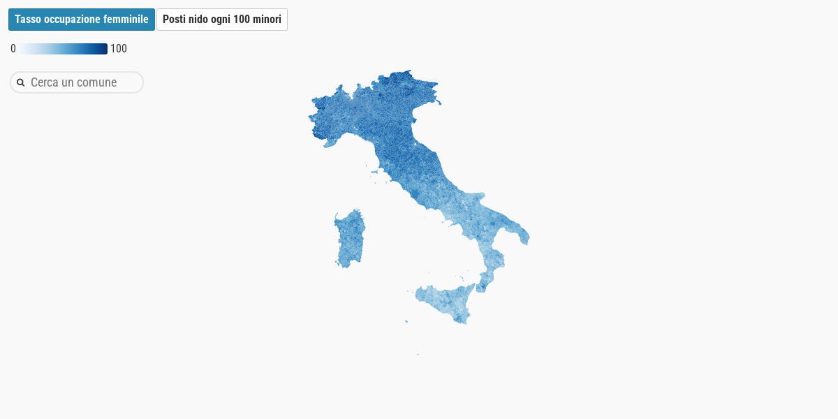 Clicca sui tasti per consultare le due mappe comunali sul tasso di occupazione femminile e sul numero di posti ogni 100 bambini tra 0 e 2 anni.