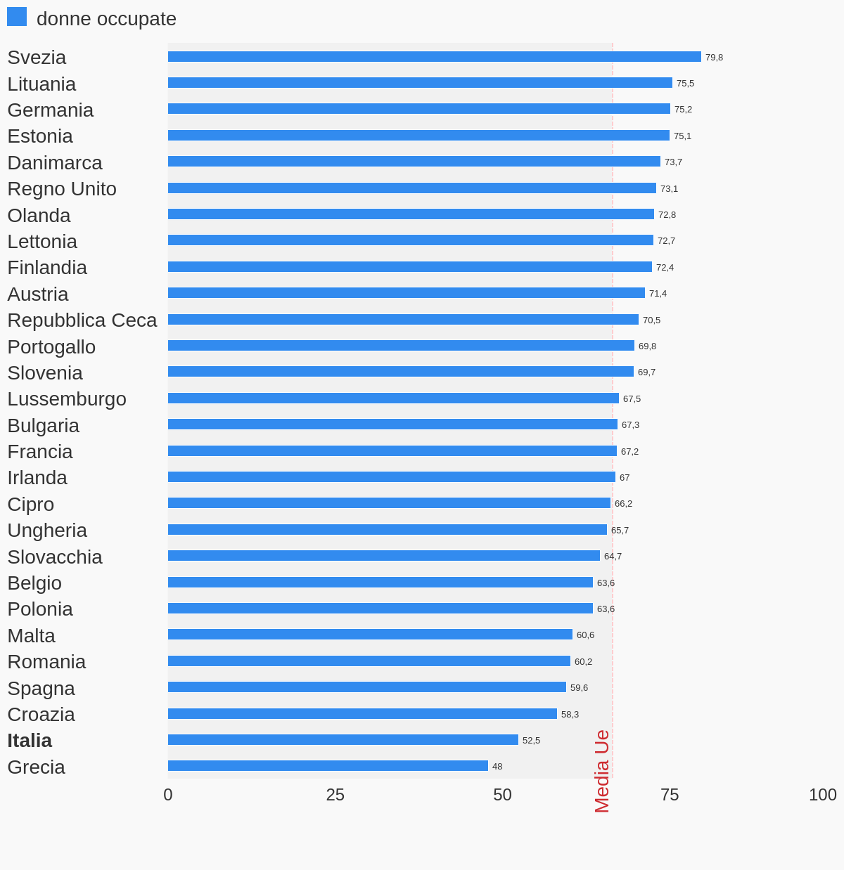 Sono 11 i paesi al di sotto della media Ue per occupazione femminile, ampiamente distanti dai primi in classifica per punti percentuali. L’Italia, con poco più della metà delle donne occupate tra i 20 e i 64 anni, supera di solo qualche punto la Grecia, all’ultimo posto.