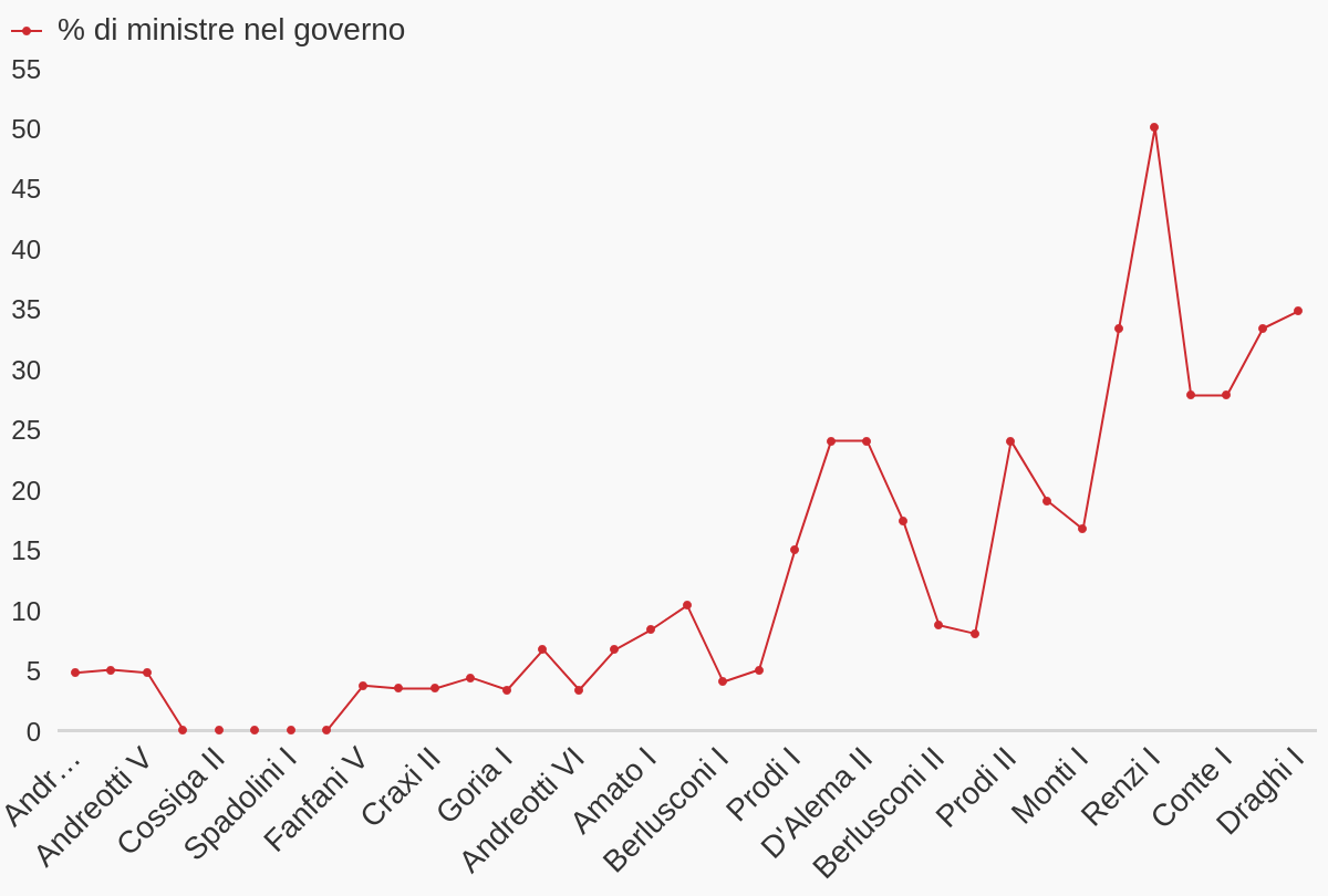 Per quanto la composizione di genere del governo Draghi resti a tutti gli effetti squilibrata, è comunque da tenere presente che gli esecutivi precedenti non avevano fatto meglio. Se si considerano i ministri a inizio incarico, a partire dal terzo governo Andreotti (il primo con una donna ministro), la quota di donne presenti nel governo Draghi è infatti seconda solo al governo Renzi, che all’inizio della sua esperienza aveva il 50% di ministre donne.