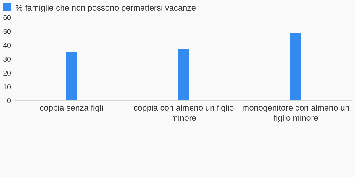 Sono soprattutto alcune tipologie familiari ad essere più in difficoltà. Tra le giovani coppie senza figli, circa il 35% non può permettersi vacanze. In presenza di almeno un figlio minore, la quota sale al 37,1%. Ma sono in particolare le famiglie monogenitoriali a dover rinunciare più spesso alle vacanze. Nel 2019, il 48,7% dei nuclei con un solo genitore e almeno un figlio minore ha dichiarato di non potersi permettere una settimana all’anno lontano da casa.