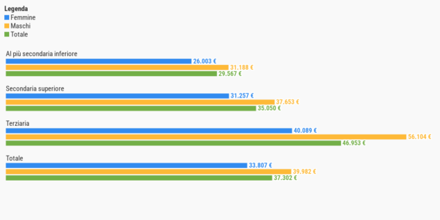 Al diminuire del livello di istruzione diminuisce la retribuzione media annua, con forti divari di genere