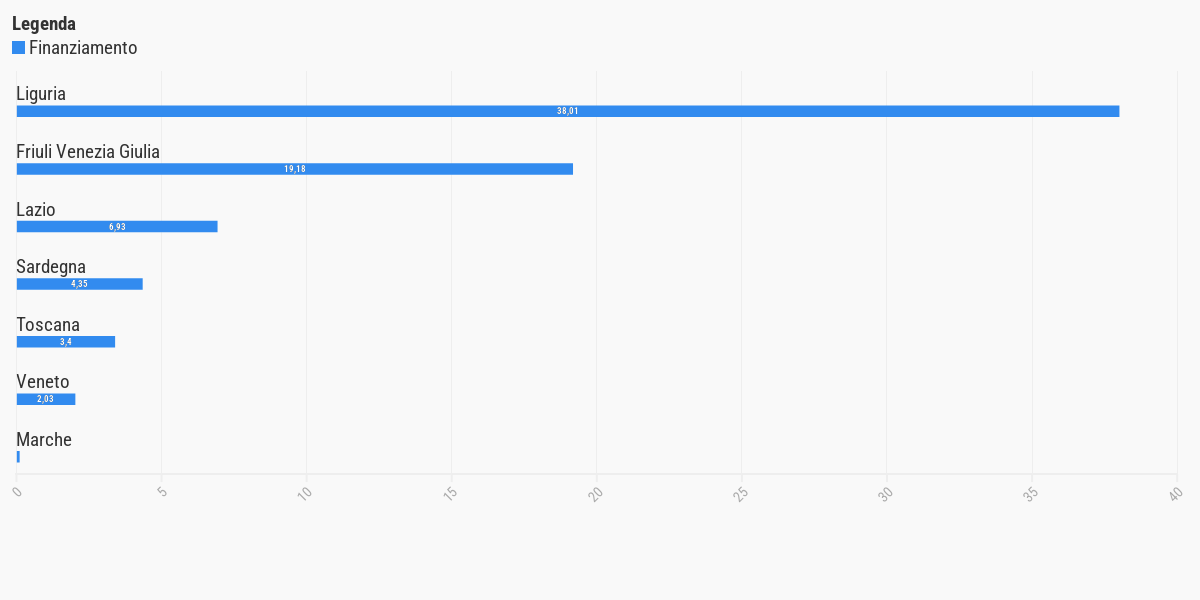 Le regioni in cui ci saranno più progetti sono Liguria (12), Toscana (5), Friuli-Venezia Giulia e Lazio (4). Per quel che riguarda gli importi, sono maggiori in Liguria (38,01 milioni) e Friuli-Venezia Giulia (19,18).