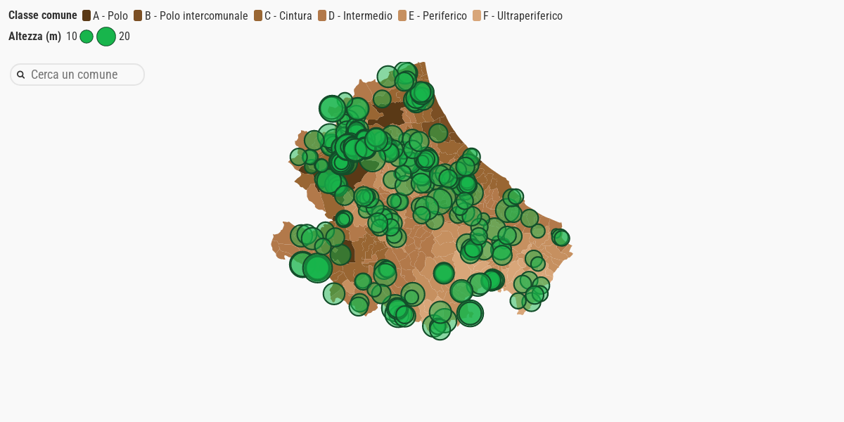 La maggior parte degli alberi monumentali abruzzesi si trova nelle zone montane (211 piante, il 71,8%). Oltre novanta alberi (94) si trovano all’interno di comuni di tipo intermedio, componendo il 32% del patrimonio arboreo monumentale della regione. Seguono per quantità di piante i comuni periferici (68, il 23,1%), quelli cintura (61, 20,7%), le città polo (42, 14,3%) e quelle ultraperiferiche (29, 9,9%). La maggior parte di queste piante si trova quindi nelle aree interne: parliamo di 193 alberi, il 65% di quelli presenti in Abruzzo.