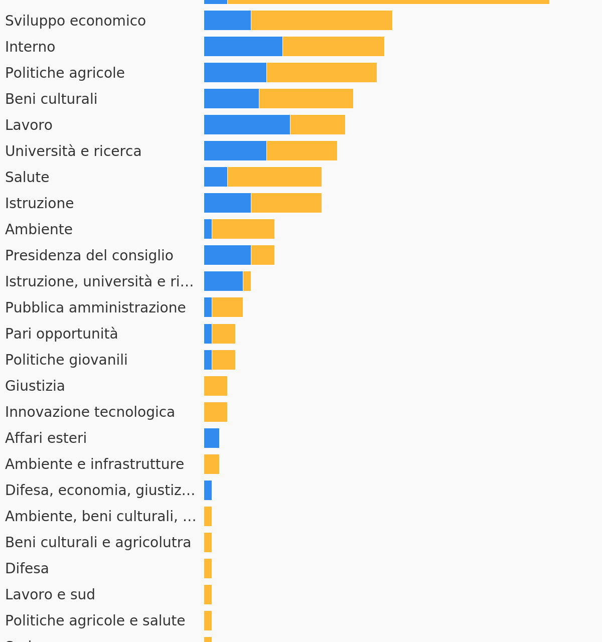 Ad oggi, il ministero chiamato a svolgere il lavoro maggiore è quello dell’economia e delle finanze che deve emanare 46 decreti attuativi. Di questi ne mancano all’appello ancora 27 (il 58,7%). Segue il ministero delle infrastrutture e dei trasporti che deve emanare 44 decreti attuativi (solo 3 già pubblicati).