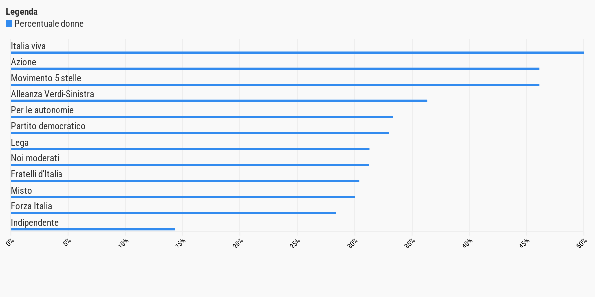 Complessivamente gli esponenti che fanno parte del governo, della camera e del senato sono 623. Di questi solo 209 sono donne, pari al 33,6%. La rappresentanza di genere però non è uguale per tutte le forze politiche. Se si considera il rapporto percentuale di donne presenti in ogni formazione possiamo osservare infatti che Italia viva può vantare una perfetta parità tra uomini e donne. Il Movimento 5 stelle e Azione si attestano sul 46,2%, segue l’alleanza Verdi-Sinistra con il 36,4%. Se si escludono i membri del governo che non sono associabili direttamente a nessun partito o gruppo parlamentare, possiamo osservare che il valore più basso lo fa registrare Forza Italia con il 28,4% di donne rispetto al totale dei propri componenti.