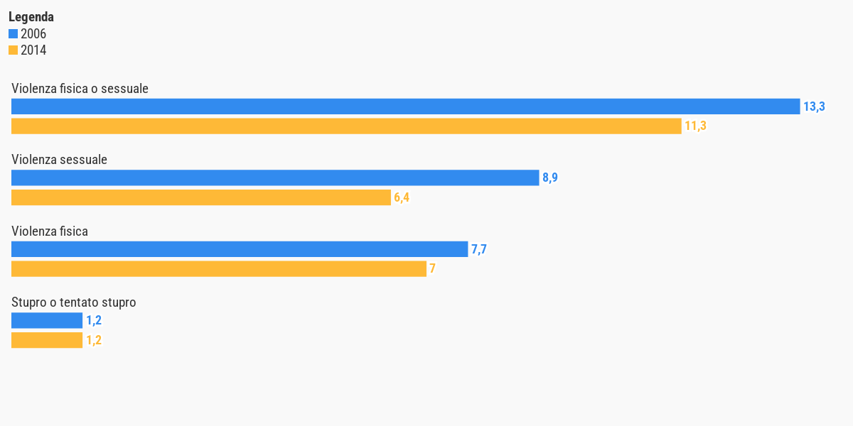 Nel confronto con i cinque anni precedenti alle due rilevazioni, almeno nelle dichiarazioni si colgono dei miglioramenti: tra le interviste del 2006 e quelle del 2014, infatti, diminuiscono sia quelle su violenza sessuale (6,4 donne ogni 100 rispetto a 8,9) che fisica (7 rispetto a 7,7). Non cambia invece il livello di donne che dichiarano di essere state vittime di violenze più gravi, come lo stupro o il tentato stupro (1,2%).