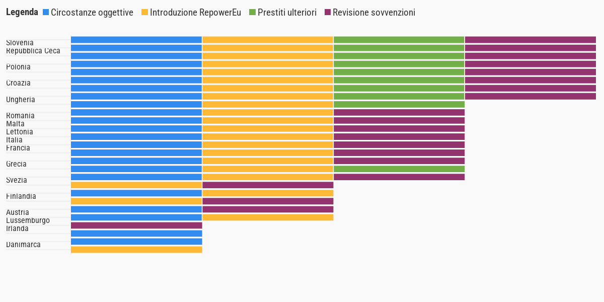 Secondo la relazione del governo per il parlamento, tutti gli stati membri hanno presentato una proposta di revisione dei rispettivi piani, modificandone sia le misure che la dotazione finanziaria. Per quanto riguarda l’Italia, le basi giuridiche con cui sono state giustificate le richieste di modifica sono 3: introduzione del RepowerEu, circostanze oggettive e richiesta di ulteriori sovvenzioni. Sono altri 9 i paesi che hanno fatto ricorso a 3 distinte giustificazioni. In 8 casi invece, tra cui la Spagna, è stato fatto riferimento a tutte le fattispecie possibili. Nel complesso, le proposte di modifica sono state motivate nell’85% dei casi dalla presenza di sopravvenute circostanze oggettive che hanno reso impossibile raggiungere determinati obiettivi. Nell’81% dei casi invece si è trattato dell’introduzione del capitolo del RepowerEu, nel 70% dell’aggiornamento del contributo finanziario massimo a fondo perduto. Le modifiche generate dalla richiesta di prestiti aggiunti rappresentano infine il 37% dei casi.