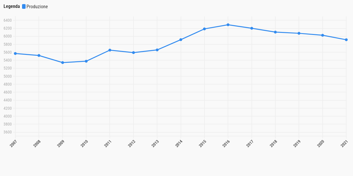 La produzione di energia geotermica ha avuto un andamento generalmente costante, rimanendo perlopiù su valori compresi tra i 5mila e i 6mila Gwh. Il dato più elevato si è registrato nel 2016 (6.289 Gwh) e da allora si è verificato un lieve ma continuo calo.