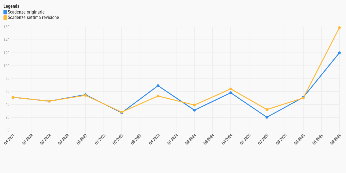 Rispetto alla versione iniziale, le varie revisioni del piano hanno portato a una significativa redistribuzione delle scadenze. Si osserva in generale uno spostamento in avanti dei traguardi e degli obiettivi. Particolarmente evidente la riduzione del carico nel quarto trimestre del 2023 e un contestuale incremento nella fase finale del piano, previsto per giugno 2026, che passa da circa 120 scadenze a quasi 160.