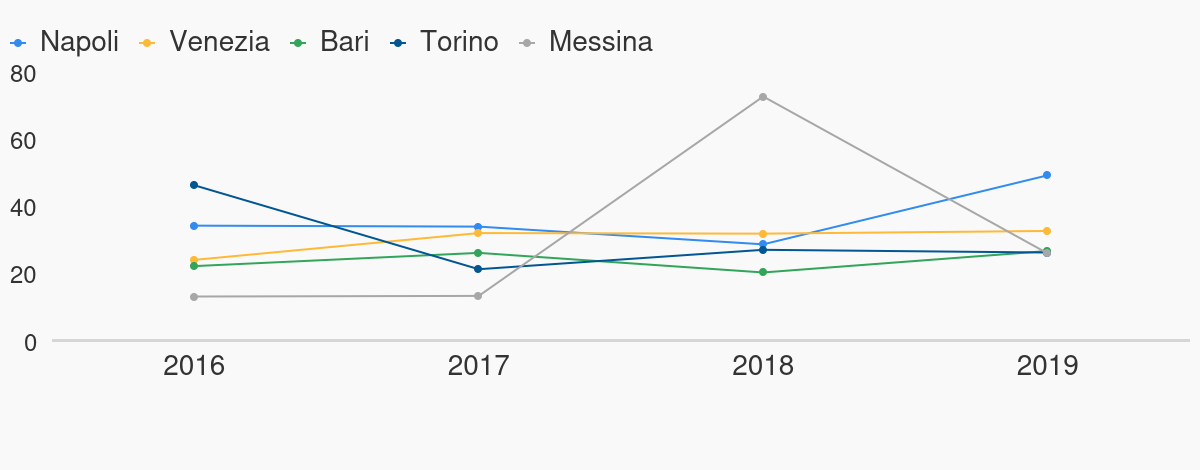 Le altre città hanno tutte incrementato gli investimenti per l'arredo urbano e la sistemazione delle piazze, oltre che per la pianificazione urbana: Napoli del 44%, Venezia del 36,1%, Bari del 20,5% e Messina addirittura del 99,1%. Tuttavia nella città siciliana è stata registrata nel bilancio consuntivo del 2018 un'entrata nettamente superiore a tutte le altre: 72,41 euro pro capite, pari a circa 17 milioni di euro di investimenti.